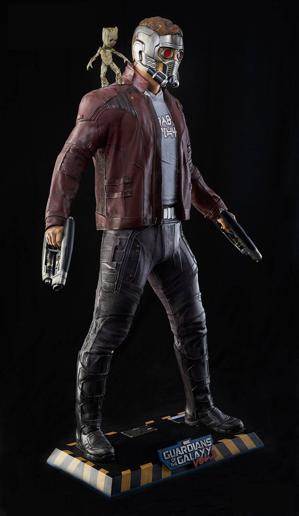 Starlord is made from fiberglass and stands a little over 6 ½ feet tall (including themed base). The “eyes” in his helmet light up and he is holding his pair of signature Quad-blasters.
